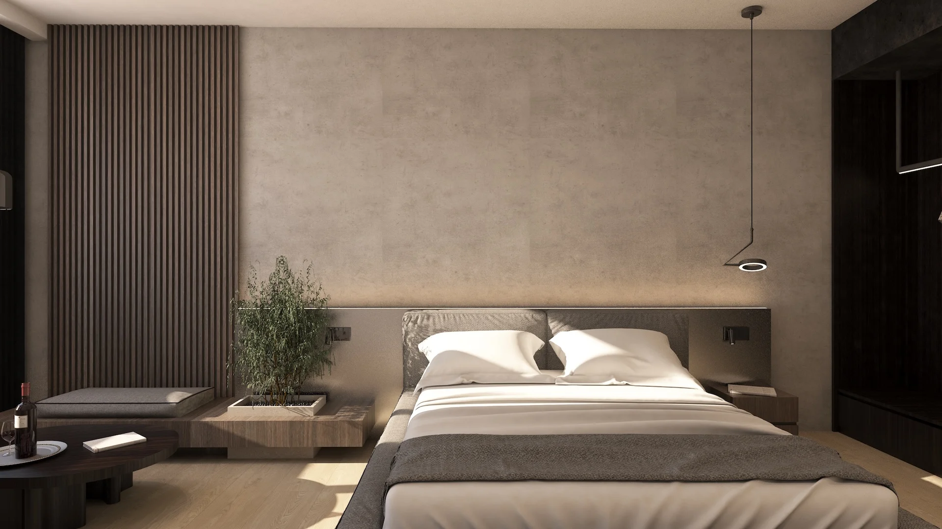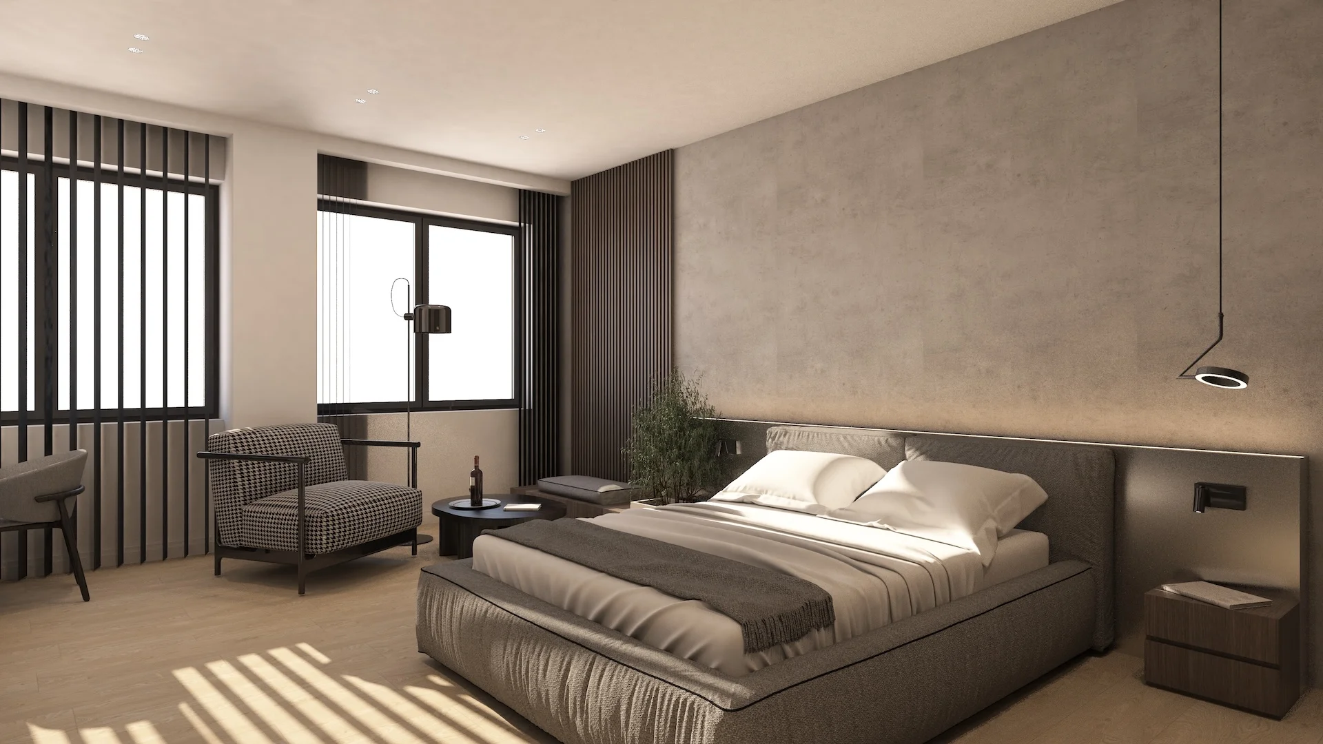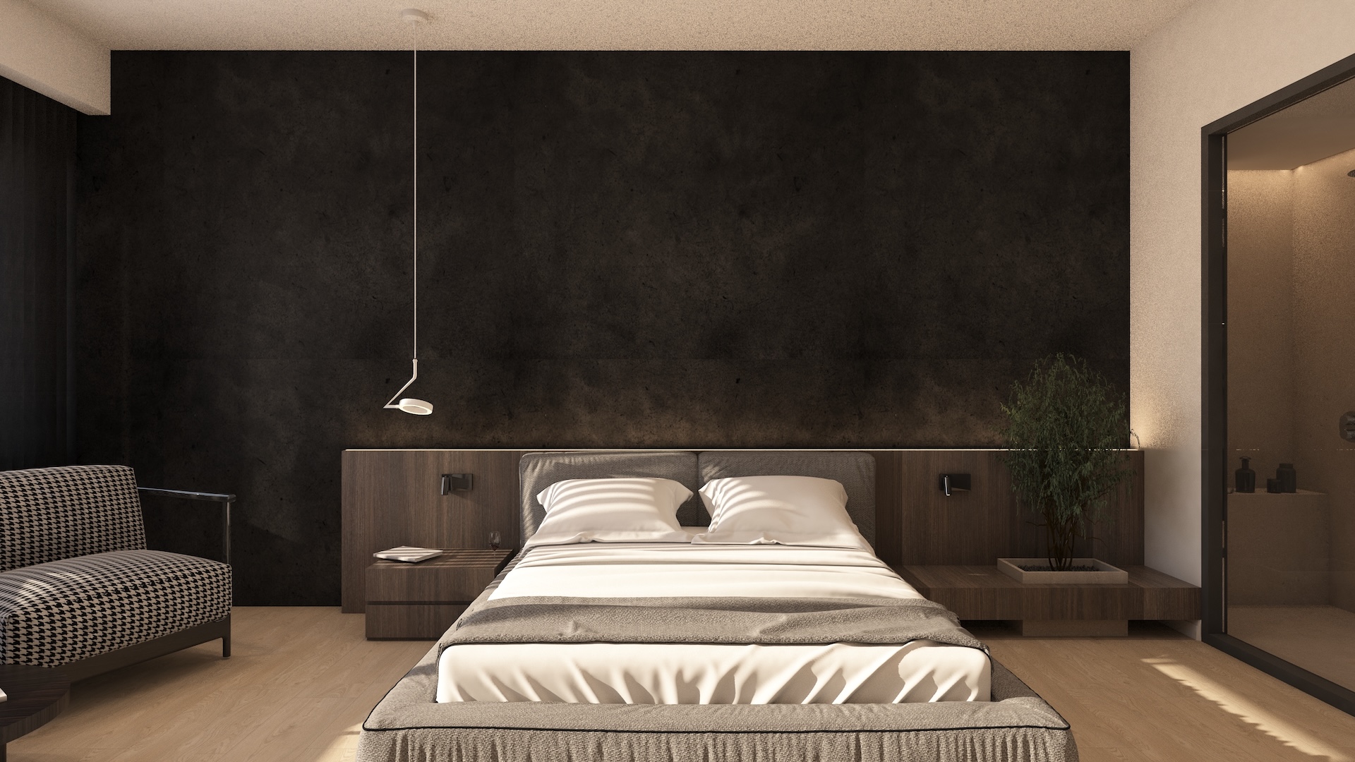 Το design ακολουθεί μια πιο ήπια, χαλαρή προσέγγιση: ζεστά ξύλινα στοιχεία, ευρύχωρα ανοίγματα, μαλακούς τόνους και γραμμική γεωμετρία που κάνει τον χώρο να δείχνει μεγαλύτερος. Το κρεβάτι είναι το κεντρικό σημείο, με minimal φωτιστικά και λεπτομέρειες που δίνουν premium χαρακτήρα.